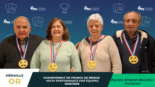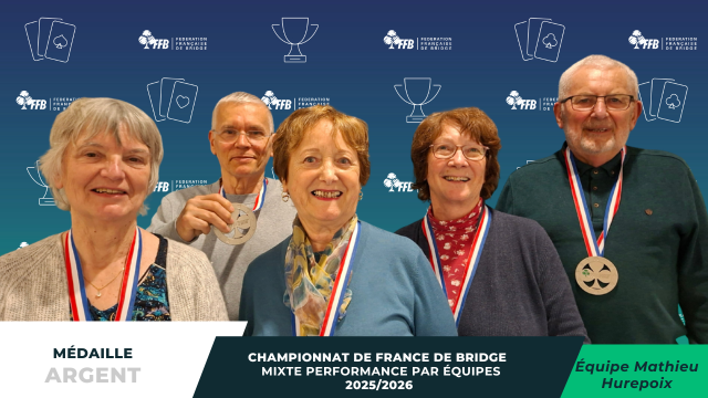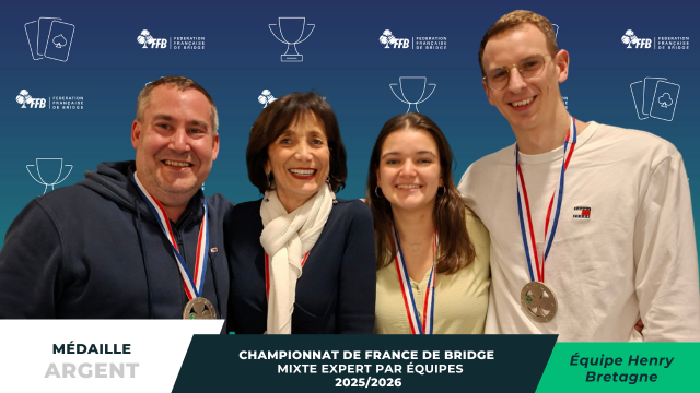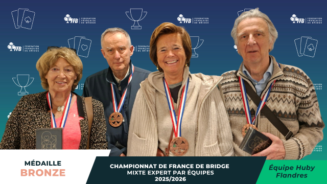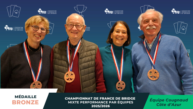 Un petit clin d'oeil à Katia Lormant du club Académie Bridge de la Côte d'Azur dont les adhérents gagnent une belle médaille de bronze : Anne-Marie Cougnaud, Marc Evrard, Patricia Blanchard, Xavier Blanchard, Nicole Allouch.